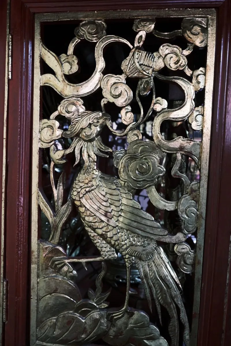 Hiện khu vực phía trong đình còn lưu giữ, bảo quản các bộ sưu tập lư, đỉnh đồng, binh khí thờ và nhiều cổ vật gốm sứ có niên đại từ thế kỷ XVIII - XIX. Trong khu vực chánh điện và gian giữa, hiện ra và thu hút chúng tôi là các mảng chạm khắc công phu “Long Phụng tranh châu”, “Bát tiên cưỡi thú”. Ở phía trên các bao lam là những bức chạm khắc Tứ Quý, Tứ Linh, Mai Điểu, Tùng Lộc, trên cùng là tấm hoành sơn son thếp vàng, chạm khắc Tứ Linh.